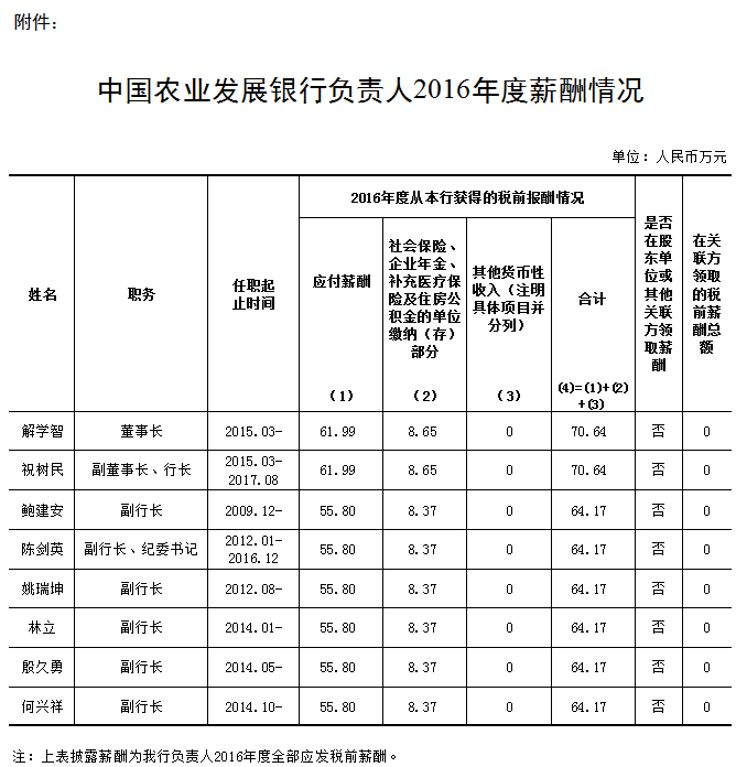自2015年1月起,中國農業(yè)發(fā)展銀行董事長、行長及其他副職負責人的薪酬,按照國家關于中央管理企業(yè)負責人薪酬制度改革的意見執(zhí)行。根據國家有關規(guī)定,現公開披露中國農業(yè)發(fā)展銀行負責人2016年度薪酬。