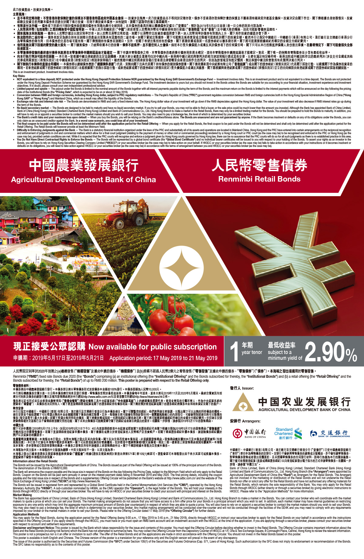 中國農(nóng)業(yè)發(fā)展銀行人民幣零售債券現(xiàn)正接受香港公眾認購 AGRICULTURAL DEVELOPMENT BANK OF CHINA RENMINBI RETAIL BONDS - NOW AVAILABLE FOR HK PUBLIC SUBSCRIPTION