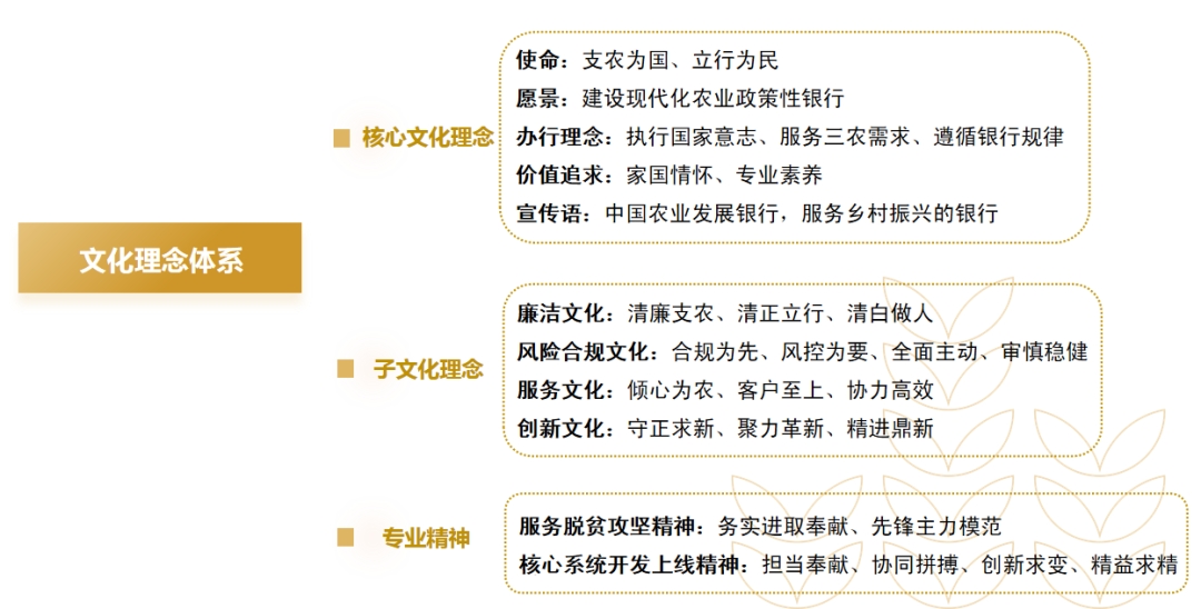 農(nóng)發(fā)行全力服務(wù)脫貧攻堅(jiān)、全面服務(wù)鄉(xiāng)村振興時(shí)期,順應(yīng)時(shí)代變革,確立了新時(shí)代文化理念體系,包括核心文化理念、四個(gè)子文化理念和專業(yè)精神。核心文化理念,即“使命:支農(nóng)為國、立行為民;愿景:建設(shè)現(xiàn)代化農(nóng)業(yè)政策性銀行;辦行理念:執(zhí)行國家意志、服務(wù)‘三農(nóng)’需求、遵循銀行規(guī)律;價(jià)值追求:家國情懷、專業(yè)素養(yǎng);宣傳語:中國農(nóng)業(yè)發(fā)展銀行,服務(wù)鄉(xiāng)村振興的銀行”。四個(gè)子文化理念,即“廉潔文化理念:清廉支農(nóng)、清正立行、清白做人;風(fēng)險(xiǎn)合規(guī)文化理念:合規(guī)為先、風(fēng)控為要、全面主動(dòng)、審慎穩(wěn)??;服務(wù)文化理念:傾心為農(nóng)、客戶至上、協(xié)力高效;創(chuàng)新文化理念:守正求新、聚力革新、精進(jìn)鼎新”。專業(yè)精神,即“服務(wù)脫貧攻堅(jiān)精神:務(wù)實(shí)進(jìn)取奉獻(xiàn)、先鋒主力模范;核心系統(tǒng)開發(fā)上線精神:擔(dān)當(dāng)奉獻(xiàn)、協(xié)同拼搏、創(chuàng)新求變、精益求精”。通過召開文化理念宣貫推進(jìn)會(huì),設(shè)計(jì)發(fā)布文化理念宣傳海報(bào),舉辦培訓(xùn)班、座談會(huì)、論壇、制作宣傳片等形式,持續(xù)開展新時(shí)代文化理念體系宣貫,不斷推進(jìn)文化理念真正成為全行員工共同的精神支柱和行為準(zhǔn)則。