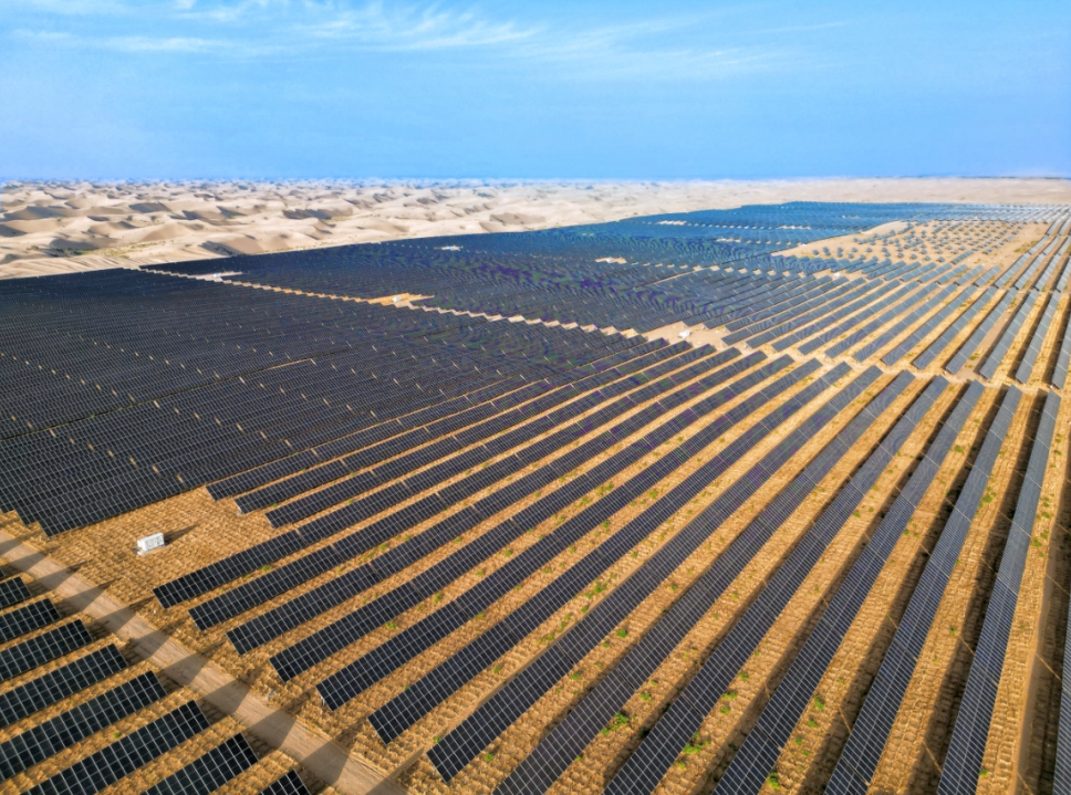 ▲農(nóng)發(fā)行貸款4.6億元,支持甘肅涼州區(qū)九墩灘100兆瓦光伏發(fā)電項目,建成后年均可節(jié)約標準煤5.8萬噸,減少二氧化碳排放當量17.3萬噸。項目在光伏板外圍栽種阻沙林帶、內(nèi)部栽植低矮灌木,有效防風固沙。