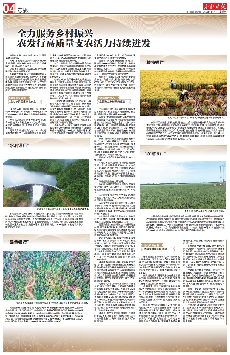 為確保黨中央方針政策在農(nóng)發(fā)行落地生效,農(nóng)發(fā)行勇于創(chuàng)新,千方百計(jì)為推進(jìn)鄉(xiāng)村振興提供更加完備適配、可得易得、長期穩(wěn)定的金融產(chǎn)品和服務(wù),并積極做好信貸支持超大特大城市城中村改造、“平急兩用”公共基礎(chǔ)設(shè)施建設(shè)、保障性住房建設(shè)前期準(zhǔn)備。今年前三季度,該行接續(xù)支持重大專項(xiàng)任務(wù),基礎(chǔ)設(shè)施基金支付率達(dá)到79%;去年以來累計(jì)向基金投資項(xiàng)目配套融資823億元;“保交樓”專項(xiàng)借款和制造業(yè)中長期貸款工作取得顯著成效。