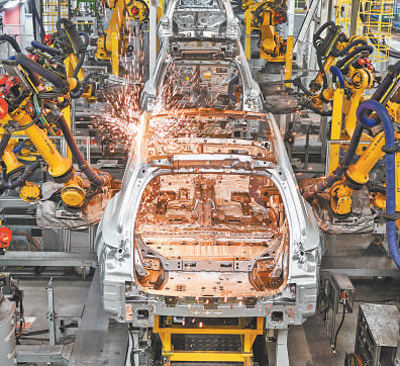 江蘇常州理想汽車(chē)智能制造基地總裝車(chē)間,機(jī)械臂正進(jìn)行焊接作業(yè)。
