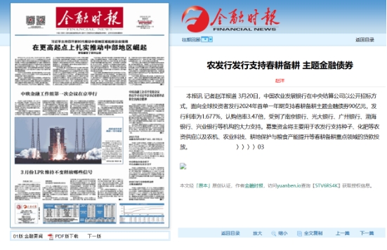 3月20日,中國農(nóng)業(yè)發(fā)展銀行在中央結(jié)算公司以公開招標方式,面向全球投資者發(fā)行2024年首單一年期支持春耕備耕主題金融債券90億元,發(fā)行利率為1.677%,認購倍率3.47倍,受到了南京銀行、光大銀行、廣州銀行、渤海銀行、興業(yè)銀行等機構(gòu)的大力支持。募集資金將主要用于農(nóng)發(fā)行支持種子、化肥等農(nóng)資供應(yīng)以及農(nóng)機、農(nóng)業(yè)科技、耕地保護與糧食產(chǎn)能提升等春耕備耕重點領(lǐng)域的貸款投放。