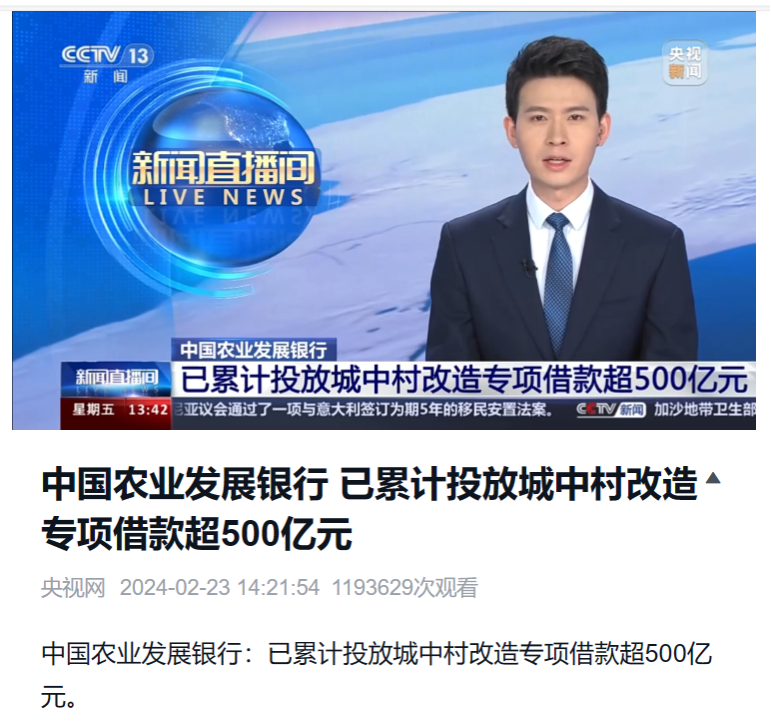 【央視新聞】中國農(nóng)業(yè)發(fā)展銀行 已累計投放城中村改造專項借款超500億元