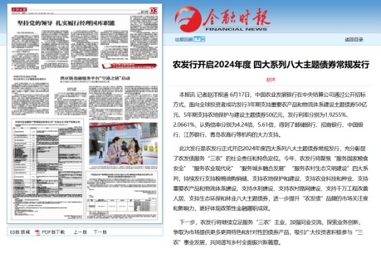 此次發(fā)行是農(nóng)發(fā)行正式開啟2024年度四大系列八大主題債券常規(guī)發(fā)行,充分彰顯了農(nóng)發(fā)債服務(wù)“三農(nóng)”的社會責(zé)任和特色定位。今年,農(nóng)發(fā)行將聚焦“服務(wù)國家糧食安全”“服務(wù)農(nóng)業(yè)現(xiàn)代化”“服務(wù)城鄉(xiāng)融合發(fā)展”“服務(wù)農(nóng)村生態(tài)文明建設(shè)”四大系列,持續(xù)發(fā)行支持糧棉油購銷儲、支持農(nóng)地保護(hù)和建設(shè)、支持農(nóng)業(yè)科技和種業(yè)、支持重要農(nóng)產(chǎn)品和物流體系建設(shè)、支持水利建設(shè)、支持農(nóng)村路網(wǎng)建設(shè)、支持千萬工程改善人居、支持生態(tài)環(huán)保和林業(yè)八大主題債券,進(jìn)一步提升“農(nóng)發(fā)債”品牌的市場關(guān)注度和影響力,更好體現(xiàn)政策性金融履職成效。
