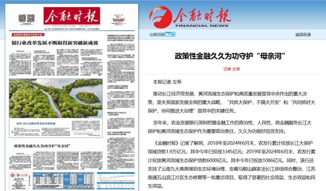 《金融時報》記者了解到,2018年至2024年6月末,農(nóng)發(fā)行累計投放長江大保護領(lǐng)域貸款1.9萬億元,其中今年已投放3345億元;2019年至2024年6月末,農(nóng)發(fā)行累計投放黃河流域生態(tài)保護貸款6000億元,其中今年已投放1086億元。同時,該行還支持了云南九大高原湖泊生態(tài)環(huán)境治理、安徽馬鞍山薛家洼長江岸線綜合整治、江蘇南通五山濱江片區(qū)生態(tài)修復等一批重點項目,取得了顯著的社會效益、生態(tài)效益和民生效益。