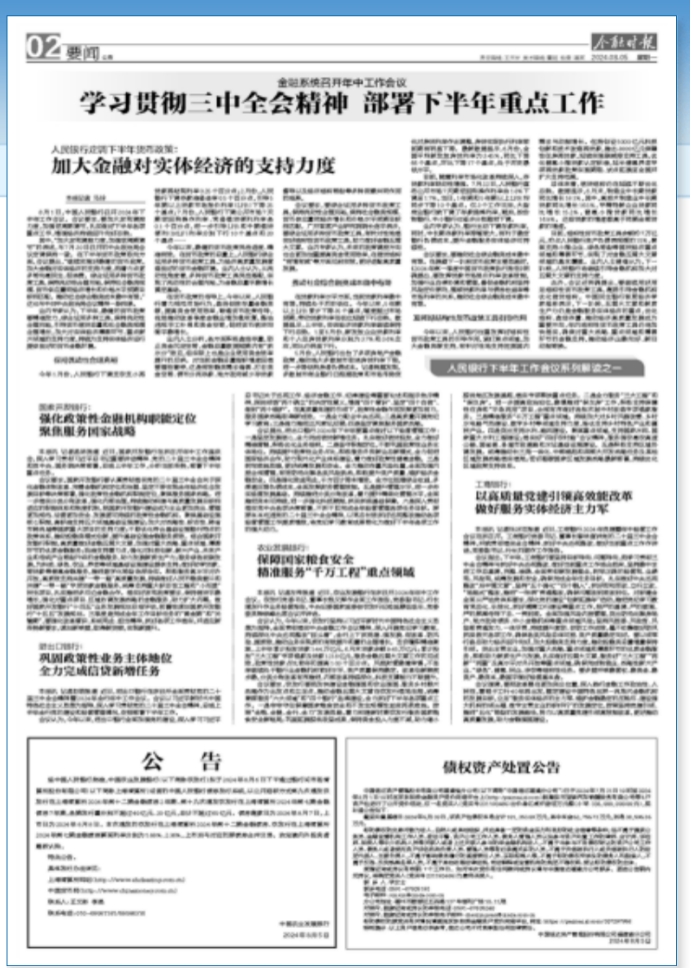 會議要求,農(nóng)發(fā)行要把加快建設(shè)金融強(qiáng)國和農(nóng)業(yè)強(qiáng)國、服務(wù)鄉(xiāng)村振興戰(zhàn)略作為出發(fā)點和立足點,推動金融五篇大文章在農(nóng)發(fā)行落地生根,統(tǒng)籌兼顧服務(wù)“六大領(lǐng)域”和“四個銀行”品牌建設(shè),全力抓好下半年各項重點工作。一是牢牢守住保障國家糧食安全和不發(fā)生規(guī)模性返貧兩條底線。按照“全糧、全鏈、全行、全力”發(fā)展思路,著力構(gòu)建新時期農(nóng)發(fā)行服務(wù)國家糧食安全新格局;鞏固拓展脫貧攻堅成果,保持資金投入力度不減,助力縮小脫貧地區(qū)發(fā)展差距,落實專項幫扶重點任務(wù)。二是全力服務(wù)“三大工程”和“保交房”。進(jìn)一步提高政治站位,穩(wěn)慎推進(jìn)“保交房”工作,積極支持保障性住房和“平急兩用”項目,合規(guī)有序做好各批次城中村改造專項借款服務(wù)。三是精準(zhǔn)服務(wù)“千萬工程”重點領(lǐng)域。持續(xù)加大對鄉(xiāng)村風(fēng)貌改善、鄉(xiāng)村水電路氣熱建設(shè)、數(shù)字鄉(xiāng)村等領(lǐng)域支持力度,擇優(yōu)支持鄉(xiāng)村特色產(chǎn)業(yè)和富民產(chǎn)業(yè)。四是突出支持水利、路網(wǎng)建設(shè)。聚焦重點領(lǐng)域,支持國家水網(wǎng)、國家重大水利工程建設(shè);落實好“四好農(nóng)村路”會議精神,服務(wù)強(qiáng)農(nóng)惠農(nóng)高速公路、國省道、縣域市政道路和水運基礎(chǔ)設(shè)施建設(shè)。五是積極支持區(qū)域協(xié)調(diào)發(fā)展。統(tǒng)籌推動長三角一體化、中部崛起和西部大開發(fā)戰(zhàn)略任務(wù)及其他區(qū)域發(fā)展戰(zhàn)略落實落地;密切跟蹤國家區(qū)域發(fā)展戰(zhàn)略最新部署,持續(xù)優(yōu)化區(qū)域政策支持體系。