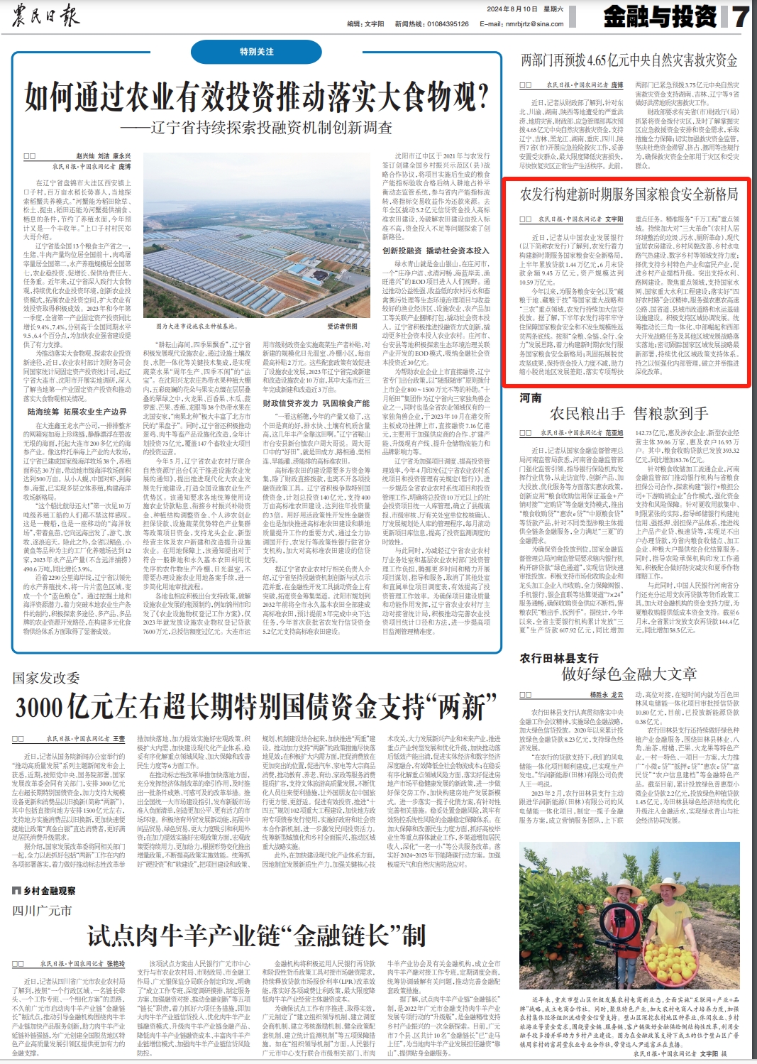 今年以來,為服務(wù)糧食安全以及“藏糧于地、藏糧于技”等國家重大戰(zhàn)略和“三農(nóng)”重點(diǎn)領(lǐng)域,農(nóng)發(fā)行持續(xù)加大信貸投放。據(jù)了解,下半年農(nóng)發(fā)行將牢牢守住保障國家糧食安全和不發(fā)生規(guī)模性返貧兩條底線。按照“全糧、全鏈、全行、全力”發(fā)展思路,著力構(gòu)建新時(shí)期農(nóng)發(fā)行服務(wù)國家糧食安全新格局;鞏固拓展脫貧攻堅(jiān)成果,保持資金投入力度不減,助力縮小脫貧地區(qū)發(fā)展差距,落實(shí)專項(xiàng)幫扶重點(diǎn)任務(wù)。精準(zhǔn)服務(wù)“千萬工程”重點(diǎn)領(lǐng)域。持續(xù)加大對“三大革命”(農(nóng)村人居環(huán)境整治的垃圾、污水、廁所革命)、現(xiàn)代宜居農(nóng)房建設(shè)、鄉(xiāng)村風(fēng)貌改善、鄉(xiāng)村水電路氣熱建設(shè)、數(shù)字鄉(xiāng)村等領(lǐng)域支持力度;擇優(yōu)支持鄉(xiāng)村特色產(chǎn)業(yè)和富民產(chǎn)業(yè),促進(jìn)鄉(xiāng)村產(chǎn)業(yè)提檔升級。突出支持水利、路網(wǎng)建設(shè)。聚焦重點(diǎn)領(lǐng)域,支持國家水網(wǎng)、國家重大水利工程建設(shè);落實(shí)好“四好農(nóng)村路”會議精神,服務(wù)強(qiáng)農(nóng)惠農(nóng)高速公路、國省道、縣域市政道路和水運(yùn)基礎(chǔ)設(shè)施建設(shè)。積極支持區(qū)域協(xié)調(diào)發(fā)展。統(tǒng)籌推動長三角一體化、中部崛起和西部大開發(fā)戰(zhàn)略任務(wù)及其他區(qū)域發(fā)展戰(zhàn)略落實(shí)落地;密切跟蹤國家區(qū)域發(fā)展戰(zhàn)略最新部署,持續(xù)優(yōu)化區(qū)域政策支持體系。持之以恒強(qiáng)化內(nèi)部管理,破立并舉推進(jìn)深化改革。