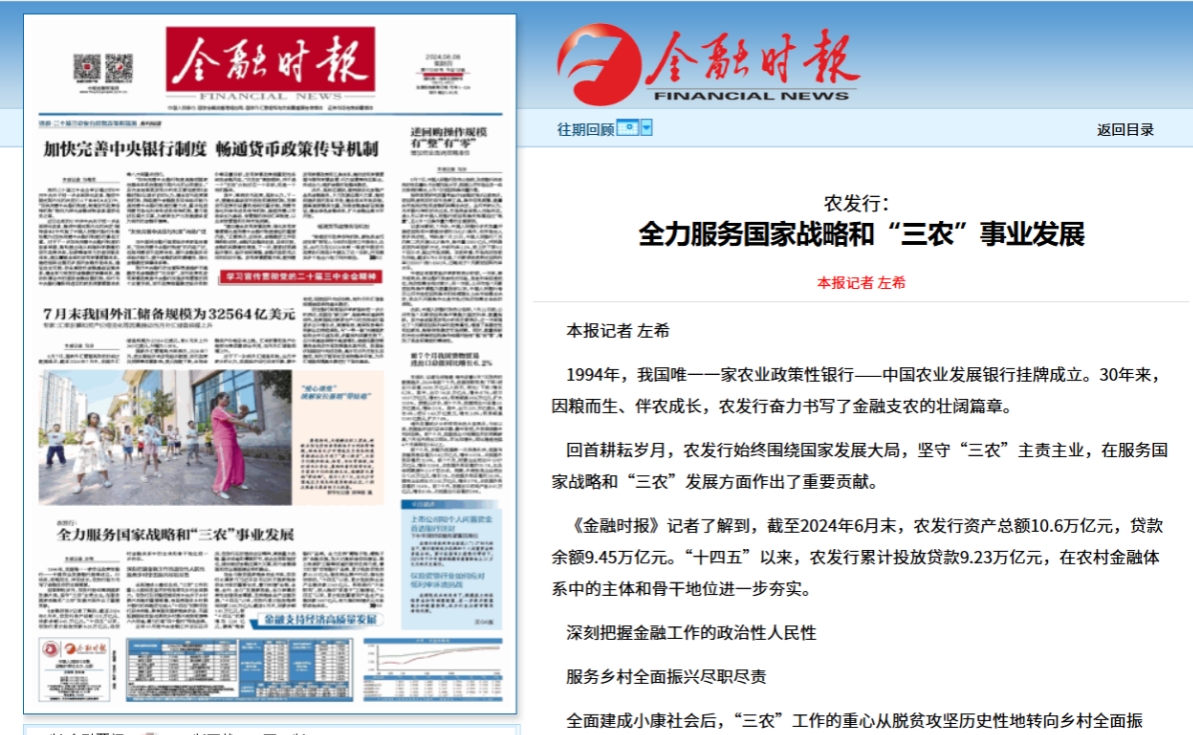 去年10月底中央金融工作會(huì)議召開(kāi)后,農(nóng)發(fā)行及時(shí)落實(shí)會(huì)議精神,聚焦重大戰(zhàn)略、重點(diǎn)領(lǐng)域和薄弱環(huán)節(jié),結(jié)合自身職能定位,謀劃做好金融五篇大文章,助力金融強(qiáng)國(guó)和農(nóng)業(yè)強(qiáng)國(guó)建設(shè)有機(jī)融合。
