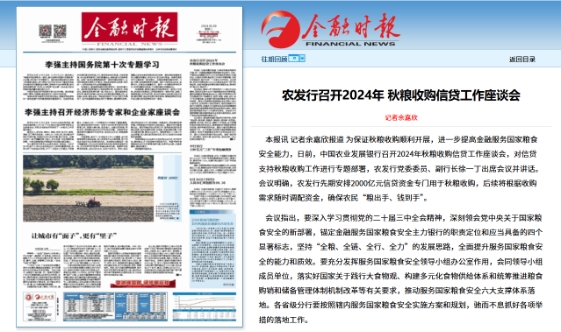會議指出,要深入學(xué)習(xí)貫徹黨的二十屆三中全會精神,深刻領(lǐng)會黨中央關(guān)于國家糧食安全的新部署,錨定金融服務(wù)國家糧食安全主力銀行的職責(zé)定位和應(yīng)當(dāng)具備的四個顯著標(biāo)志,堅(jiān)持“全糧、全鏈、全行、全力”的發(fā)展思路,全面提升服務(wù)國家糧食安全的能力和質(zhì)效。要充分發(fā)揮服務(wù)國家糧食安全領(lǐng)導(dǎo)小組辦公室作用,會同領(lǐng)導(dǎo)小組成員單位,落實(shí)好國家關(guān)于踐行大食物觀、構(gòu)建多元化食物供給體系和統(tǒng)籌推進(jìn)糧食購銷和儲備管理體制機(jī)制改革等有關(guān)要求,推動服務(wù)國家糧食安全六大支撐體系落地。各省級分行要按照轄內(nèi)服務(wù)國家糧食安全實(shí)施方案和規(guī)劃,馳而不息抓好各項(xiàng)舉措的落地工作。