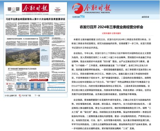 會(huì)議指出,今年以來,農(nóng)發(fā)行全行上下堅(jiān)持以習(xí)近平新時(shí)代中國特色社會(huì)主義思想為指導(dǎo),深入貫徹落實(shí)黨的二十大和二十屆三中全會(huì)精神,貫徹落實(shí)中央金融工作會(huì)議精神,常態(tài)長效抓好中央巡視“回頭看”整改,從嚴(yán)從實(shí)推進(jìn)黨紀(jì)學(xué)習(xí)教育,遵循“六個(gè)相統(tǒng)一”工作要求,統(tǒng)籌高質(zhì)量發(fā)展“六個(gè)要素”,各項(xiàng)工作扎實(shí)有力開展,高質(zhì)量發(fā)展取得積極成效。一是經(jīng)營穩(wěn)健質(zhì)量穩(wěn)定。前三季度累計(jì)發(fā)放貸款1.96萬億元,貸款余額凈增0.84萬億元,增速9.52%,金融五篇大文章工作成效持續(xù)彰顯,不良率繼續(xù)處于較好水平,資產(chǎn)質(zhì)量保持穩(wěn)定。二是結(jié)構(gòu)優(yōu)化管理提升。政策性貸款占比較年初提高0.51個(gè)百分點(diǎn),“四個(gè)銀行”特色品牌相關(guān)貸款平均增速高于全行5.67個(gè)百分點(diǎn),內(nèi)控合規(guī)關(guān)鍵指標(biāo)保持在正常區(qū)間。 三是改革深化創(chuàng)新賦能。業(yè)務(wù)分類方案正式獲得國務(wù)院批準(zhǔn),內(nèi)部改革有序推進(jìn),科技支撐進(jìn)一步強(qiáng)化,信貸業(yè)務(wù)數(shù)字化轉(zhuǎn)型取得突破,業(yè)務(wù)模式創(chuàng)新持續(xù)推進(jìn),發(fā)展勢能不斷增強(qiáng)。
