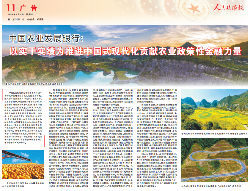 堅守職能定位,恪守使命為“三農”。農發(fā)行堅決扛穩(wěn)農業(yè)政策性銀行政治責任,矢志不渝將解決“三農”領域最現(xiàn)實最緊迫的問題作為全行工作的出發(fā)點和落腳點,著力在構建與商業(yè)性銀行有所區(qū)別、互為補充的差序格局中,當好政府和市場的橋梁、戰(zhàn)略落地的工具、宏觀調控的手段、政策扶持的渠道和引領市場的標桿。履職成效全面提升。錨定農業(yè)強國、金融強國建設目標,持續(xù)加大對重大戰(zhàn)略、重點領域和薄弱環(huán)節(jié)的支持力度,依托“四級機構”優(yōu)勢,聚焦服務國家糧食安全、鞏固拓展脫貧攻堅成果、城鄉(xiāng)融合發(fā)展、國家區(qū)域協(xié)調發(fā)展等主責主業(yè)精準發(fā)力,“四個銀行”特色品牌持續(xù)擦亮。2024年糧棉油貸款累放和凈增創(chuàng)近10年新高,農地貸款增速高于全行平均增速17.7個百分點,水利建設貸款投放穩(wěn)居金融同業(yè)前列,先后兩年獲評“綠色銀行評價先進單位”。全力以赴完成好黨中央交辦的各項工作任務,2024年投放“三大工程”相關貸款2347億元。扎實做好定點幫扶,連續(xù)7年在中央單位定點幫扶工作成效評價中獲得“好”的最高等次。經(jīng)營質效穩(wěn)健向好。市場化籌資提質增效,流動性管理更加精細,強化量、價、險、效統(tǒng)籌,資源配置效能有效提升,財務可持續(xù)保持韌勁。風險防控有力有效。統(tǒng)籌發(fā)展和安全,嚴格落實監(jiān)管要求,嚴守業(yè)務經(jīng)營邊界,壓實各層級風險管理責任,強化信貸全流程管理和重點領域風險防控,建立健全風險預警機制,牢牢把握防范化解重大風險戰(zhàn)略主動權,堅決守住不發(fā)生系統(tǒng)性風險底線。