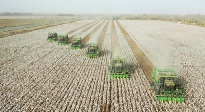 ▲巴州尉犁縣高標(biāo)準(zhǔn)棉田機(jī)械化收割場(chǎng)景