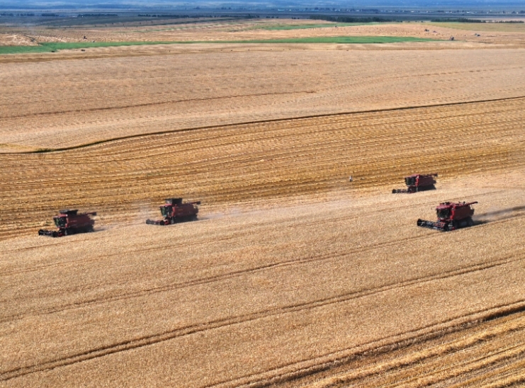▲伊犁昭蘇縣小麥機(jī)械化收割場(chǎng)景