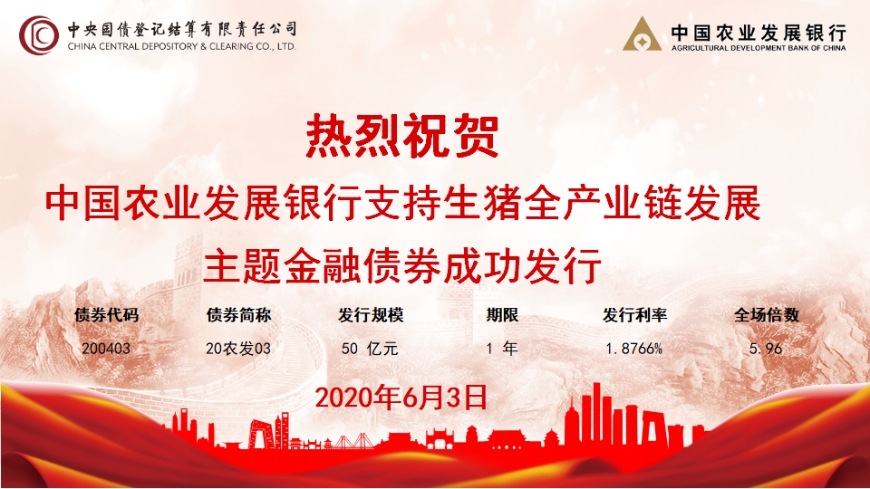 6月3日,農(nóng)發(fā)行通過公開招標方式,第三次成功發(fā)行1年期支持生豬全產(chǎn)業(yè)鏈發(fā)展主題金融債券。發(fā)行規(guī)模50億元,發(fā)行利率1.8766%,比上一日收益率水平低6個基點,認購倍率5.96倍。
