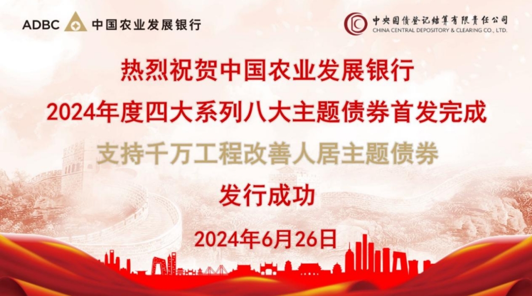 6月26日,中國(guó)農(nóng)業(yè)發(fā)展銀行在中央結(jié)算公司以公開招標(biāo)方式,首次發(fā)行10年期支持千萬工程改善人居主題債券160億元,發(fā)行利率為2.3228%,認(rèn)購(gòu)倍率為2.91倍,獲得了工商銀行、徽商銀行、浦發(fā)銀行、大連銀行、上海銀行等機(jī)構(gòu)的踴躍認(rèn)購(gòu)。至此,農(nóng)發(fā)行2024年度四大系列八大主題債券首發(fā)工作順利完成。