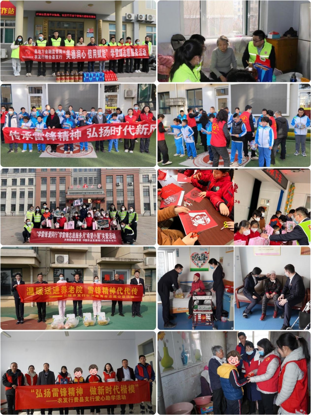以3月5日“學雷鋒紀念日”為契機,每年組織青年志愿者結(jié)合自身實際開展形式多樣、各具特色的學雷鋒志愿公益活動。組織開展“喜迎建團百年·學雷鋒講奉獻”主題學雷鋒志愿公益活動,全系統(tǒng)1.3萬余名團員青年參與其中,活動時長達1萬余小時。組織青年志愿者走進社區(qū)向居民發(fā)放金融知識小折頁,宣講防詐知識;送金融知識進企業(yè),助力有效解決企業(yè)在辦理業(yè)務中遇到的難題;關愛“一老一小”,提升特殊群體的幸福感、獲得感,弘揚中華民族傳統(tǒng)美德;動員無償獻血,為愛心事業(yè)注入新鮮血液,傳遞農(nóng)發(fā)行青年的溫暖。在“農(nóng)發(fā)e家”公眾號開設“3·5學雷鋒”專欄,宣傳農(nóng)發(fā)行青年志愿者積極參與志愿服務,投身社會文明建設,促進文明實踐的生動事跡。