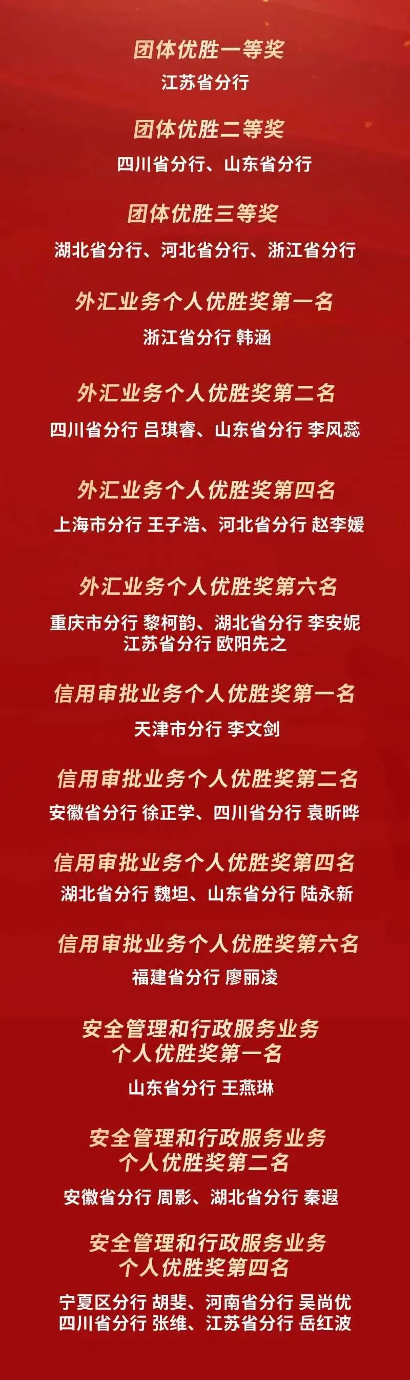 奮斗如筆,繪就精彩篇章;初心如炬,點燃拼搏熱情。參加此次競賽的團隊和選手是全行外匯業(yè)務(wù)、信用審批業(yè)務(wù)、安全管理和行政服務(wù)條線的業(yè)務(wù)能手,是農(nóng)發(fā)行廣大職工銳意進取、創(chuàng)先爭優(yōu)的縮影,是農(nóng)發(fā)行勞模精神、勞動精神、工匠精神的生動體現(xiàn)。希望廣大職工以先進典型為榜樣,在各自崗位上踔厲奮發(fā)、砥礪前行,積極投身金融強國和農(nóng)業(yè)強國建設(shè)??傂泄⒁源舜胃傎悶槠鯔C,持續(xù)擦亮“金農(nóng)發(fā)行杯”勞動競賽品牌,使勞動競賽成為提升職工專業(yè)素質(zhì)的課堂、激發(fā)職工勞動潛能的舞臺、促進職工成長成才的平臺,不斷為農(nóng)發(fā)行高質(zhì)量發(fā)展和現(xiàn)代化建設(shè)注入新的活力。