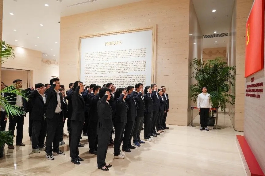 參觀結(jié)束后,在場館工作人員的引導(dǎo)下,大家再次重溫入黨誓詞。面對鮮紅的黨旗,分部總經(jīng)理蘇靜帶領(lǐng)支部新老黨員一起高舉右手莊嚴(yán)宣誓。鏗鏘恢宏的誓詞,強(qiáng)烈震撼著在場的每一位黨員,一字一句,神圣而豪邁,體現(xiàn)了黨員同志們對中國共產(chǎn)黨的無限忠誠。