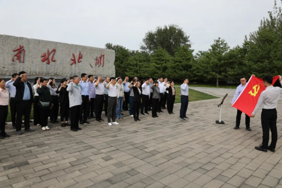 活動當天上午,全體人員聽取基礎設施部黨支部水利處負責同志介紹農(nóng)發(fā)行“水利銀行”品牌建設情況。下午,前往南水北調(diào)團城湖調(diào)節(jié)池開展現(xiàn)場教學,參觀南水北調(diào)紀念園,深入了解南水北調(diào)工程建設歷程和發(fā)揮作用情況。在“飲水思源”紀念碑前,全體人員重溫入黨誓詞,面向黨旗莊嚴宣誓。參觀結束后,全體人員觀看新華社短片《跟著總書記“瞰”南水北調(diào)工程》,進一步親身感受習近平總書記對人民飲水保障的高度重視和深情掛念。部分青年黨員圍繞“一泓清水潤南北、青春接力述擔當”作交流分享,以親身體會述說了南水北調(diào)工程給沿線地區(qū)帶來的巨大變化,并深情朗誦了歌頌南水北調(diào)工程與農(nóng)發(fā)行履職擔當?shù)母木幵姼琛赌纤鎏觥贰?